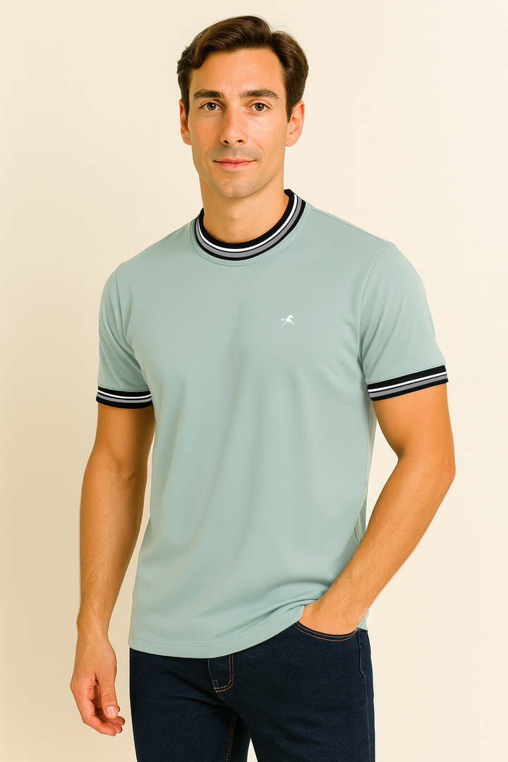 Esta camiseta verde claro para hombre combina un estilo moderno con una comodidad excepcional, ideal para quienes buscan una prenda versátil y con presencia. Su cuello redondo incorpora un ribete en contraste en tonos negro y blanco, un detalle que también se repite en las mangas, aportando un toque dinámico y actual al diseño.