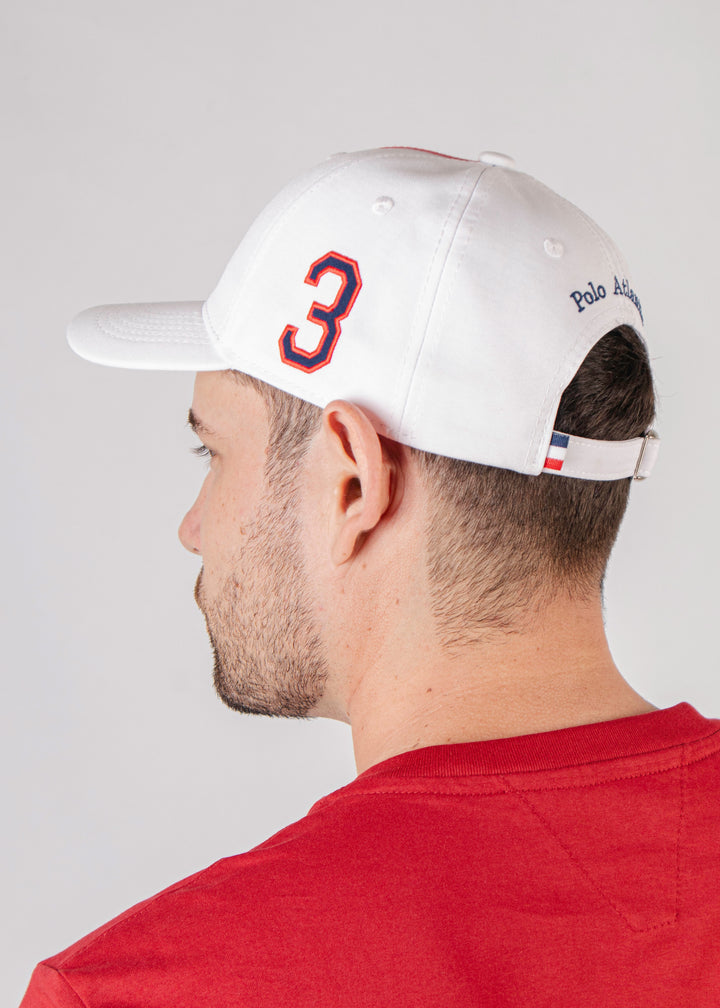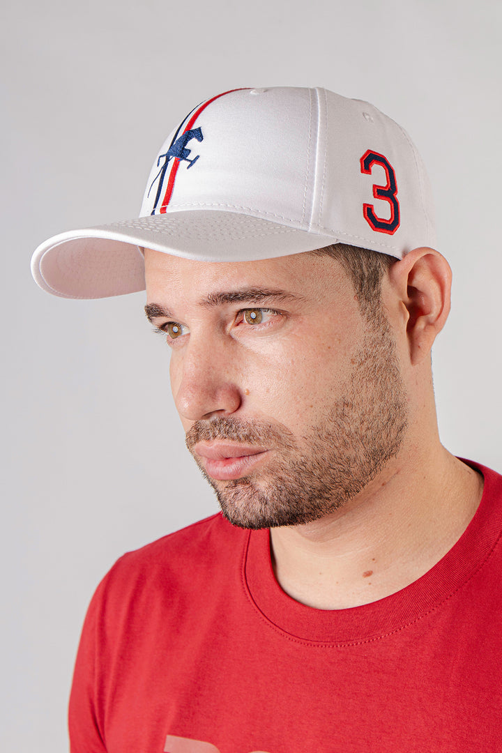 Completa tu look con esta gorra de inspiración deportiva, ideal para quienes valoran el estilo clásico con un toque moderno. Presenta un diseño frontal con un bordado de jinete de polo y una doble línea vertical que aporta dinamismo visual. En el lateral, un gran número bordado añade carácter y personalidad.