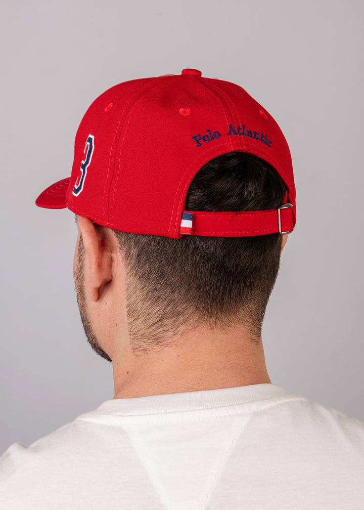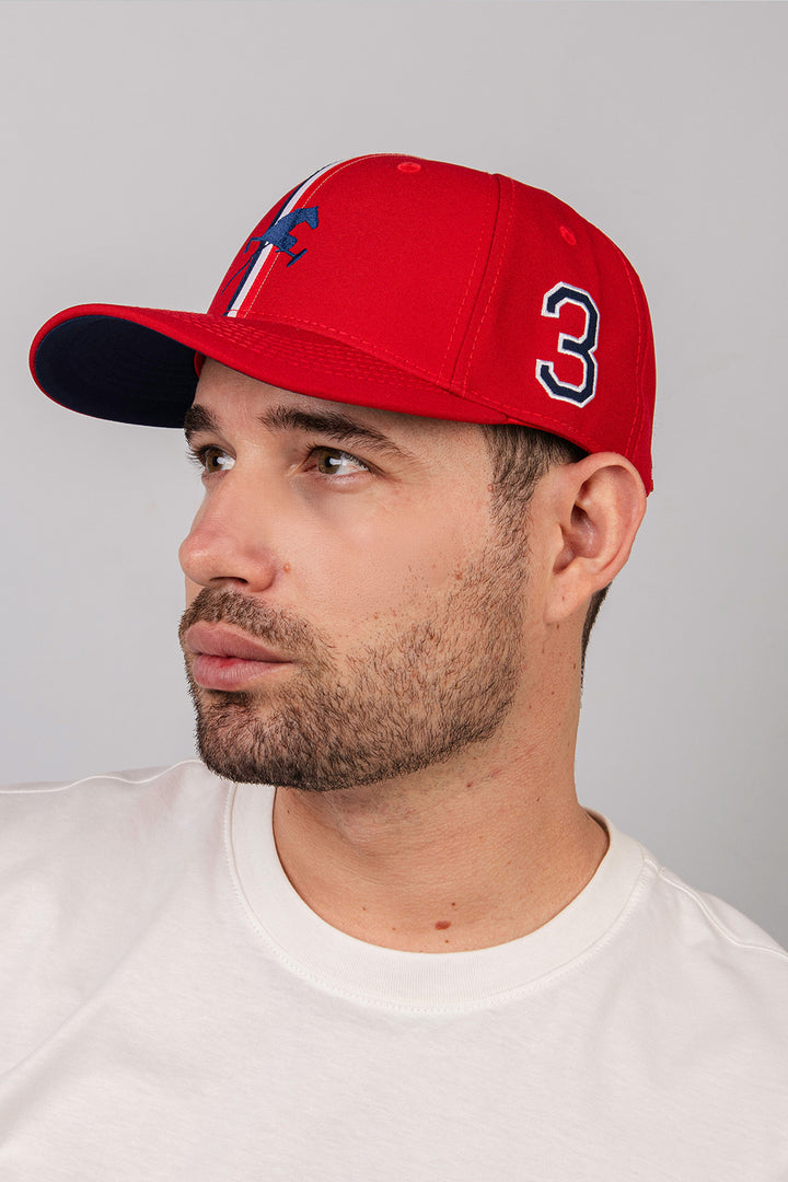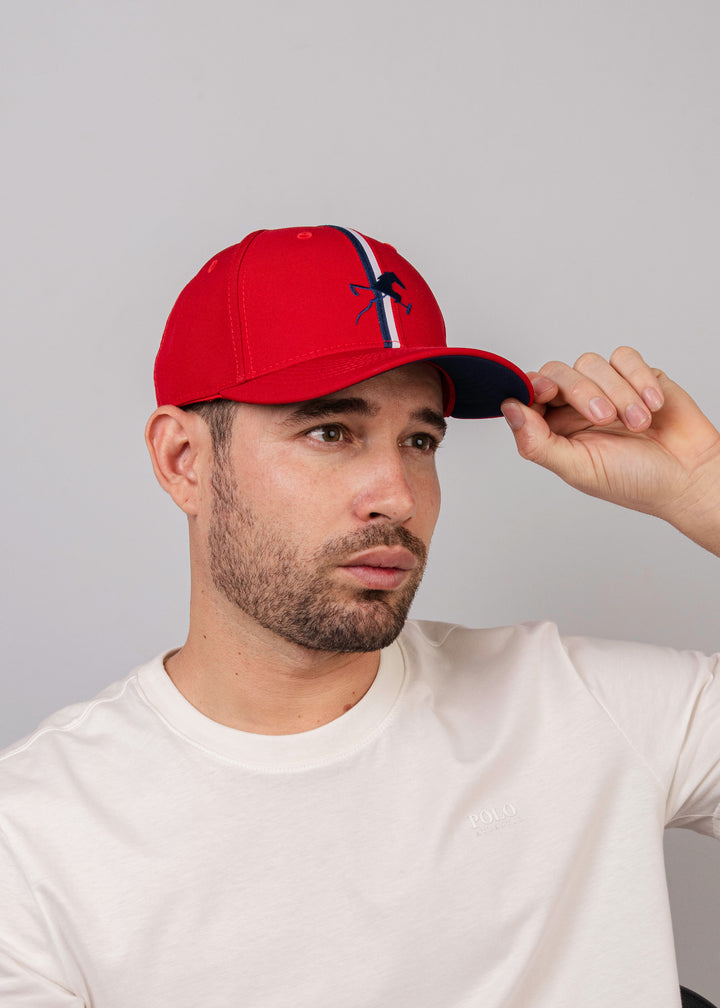 Completa tu look con esta gorra de inspiración deportiva, ideal para quienes valoran el estilo clásico con un toque moderno. Presenta un diseño frontal con un bordado de jinete de polo y una doble línea vertical que aporta dinamismo visual. En el lateral, un gran número bordado añade carácter y personalidad.